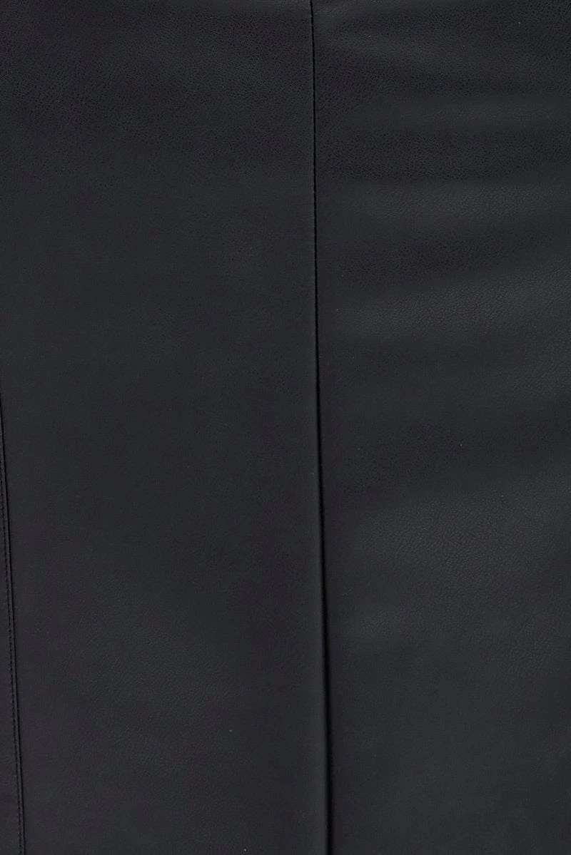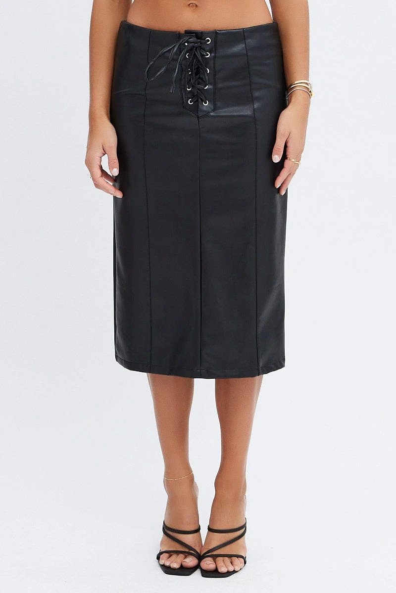 Black Midi Skirt Low Rise Lace Up Front Faux Leather PU