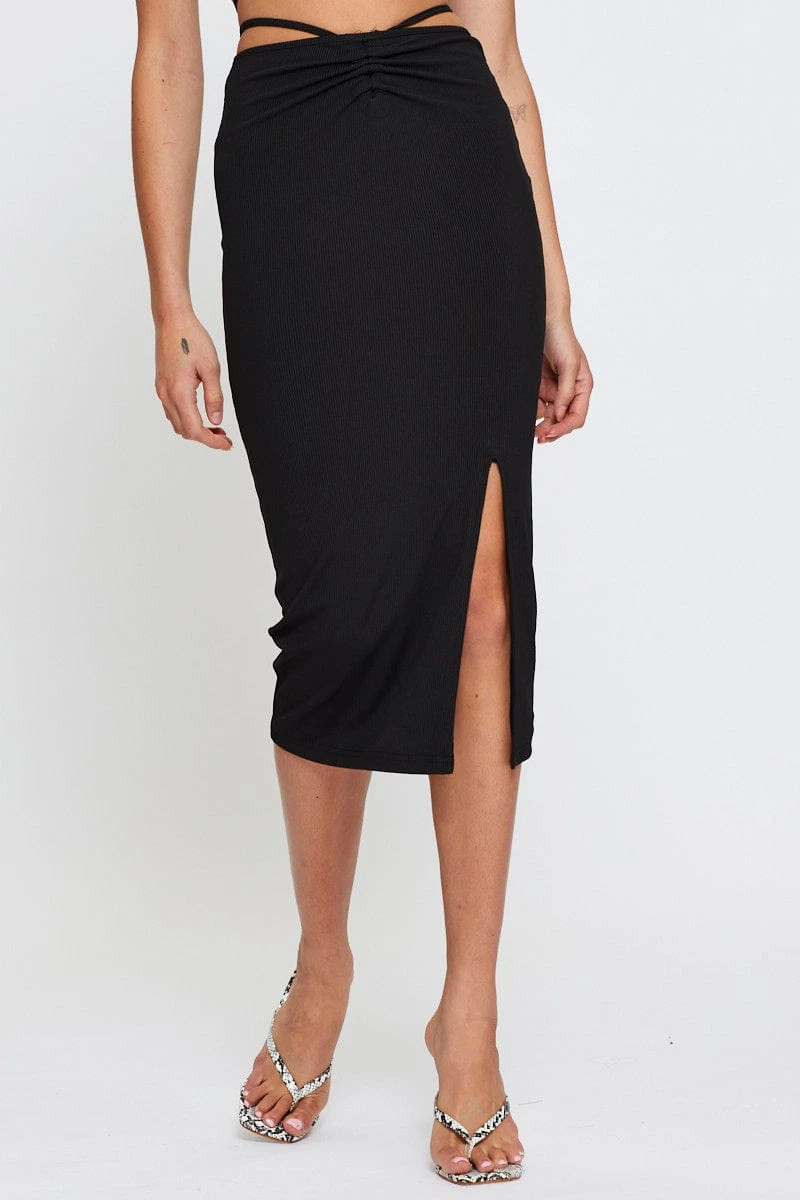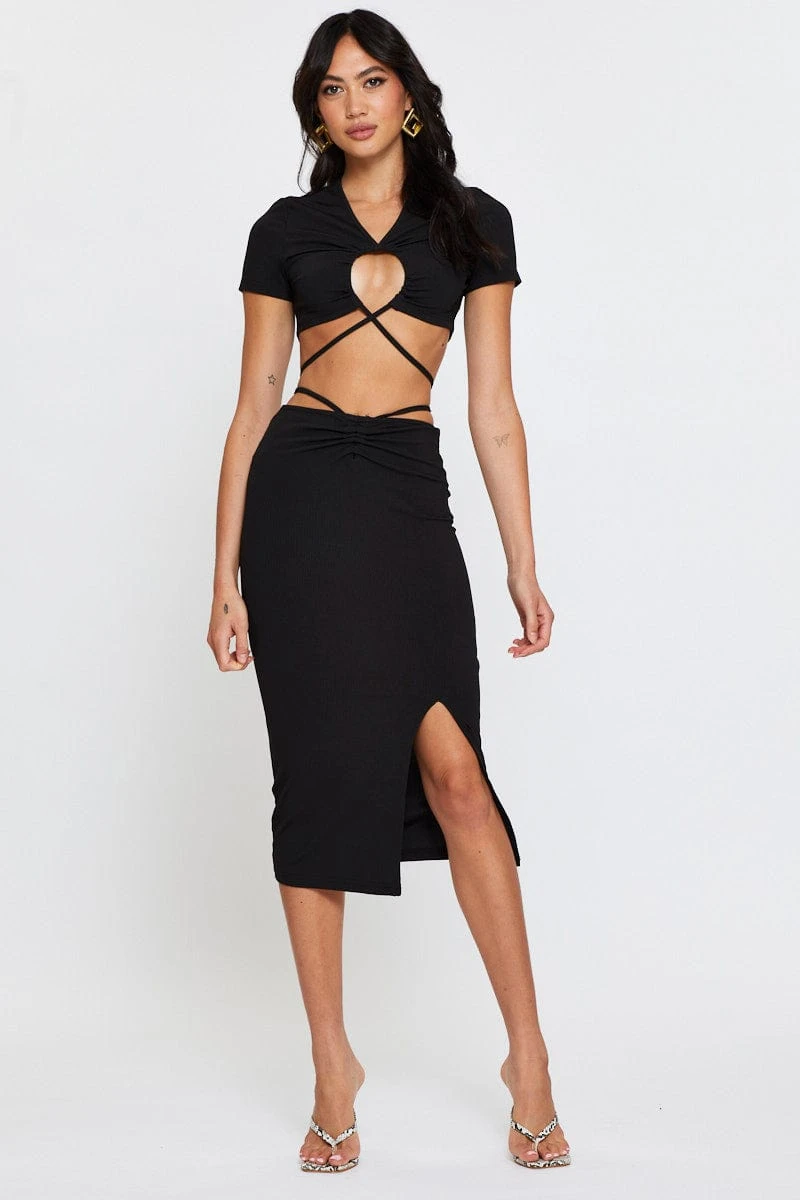 Features: Ribbed Material, Side Split, Tie Detail, Bodycon