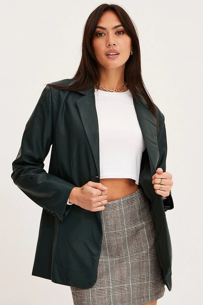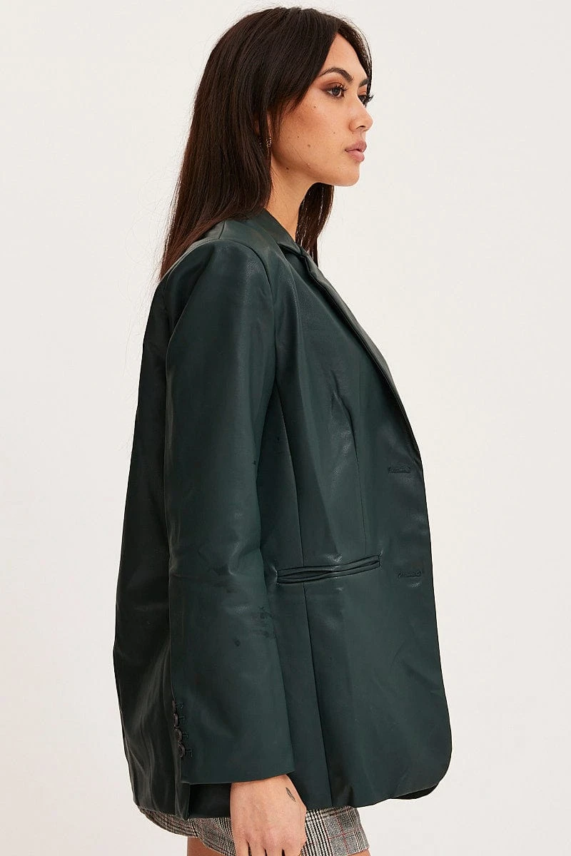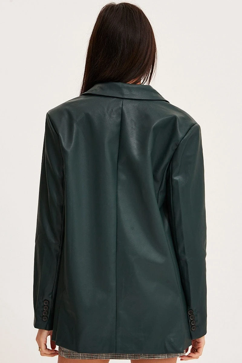 Features: Collared Neckline, Faux Pockets, Button Cuffed Sleeves, Pu Faux Leather