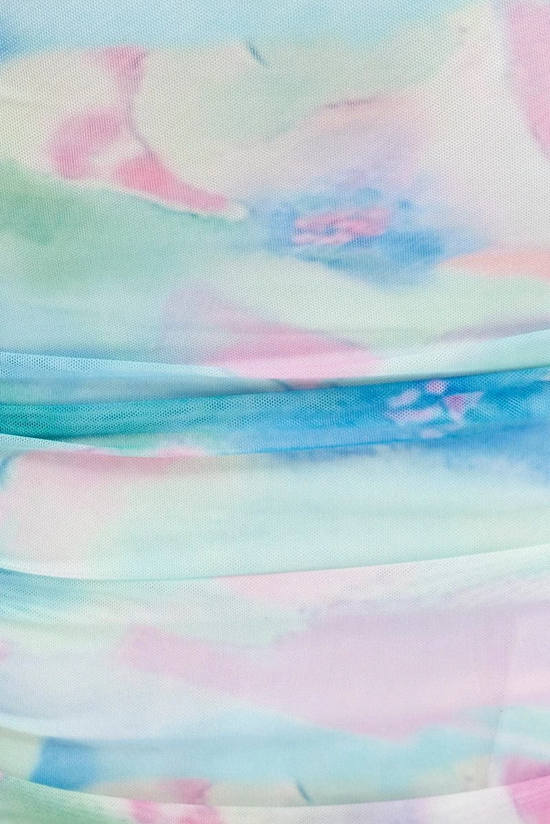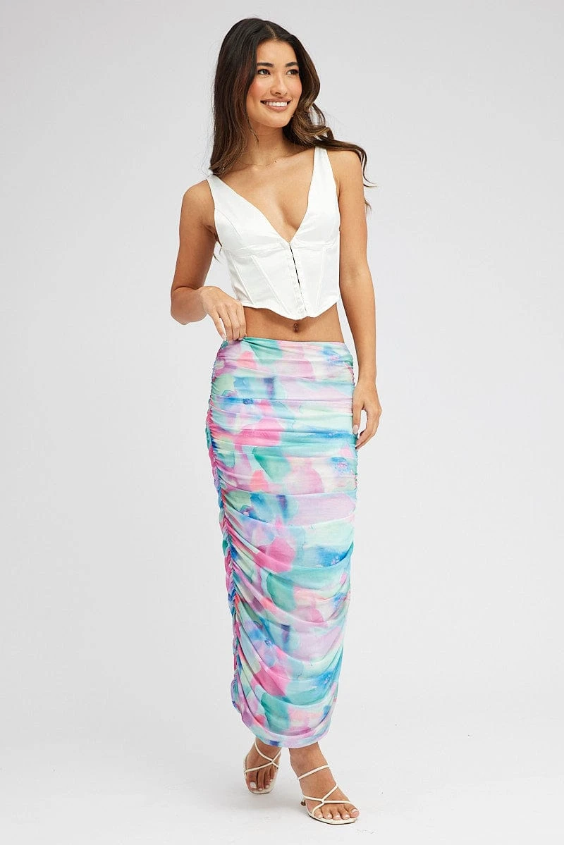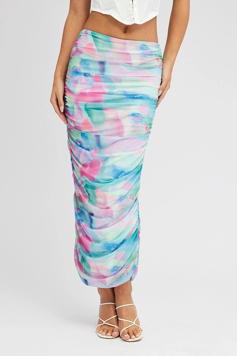 Multi Abstract Midi Skirt Side Ruched Mesh